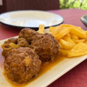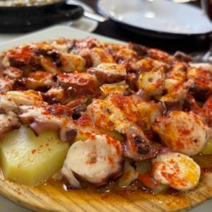 Plato estrella de Isla Cristina que combina merluza fresca con una salsa de mariscos, verduras y especias locales. Su sabor refleja la esencia marinera y la tradición festiva de la localidad.